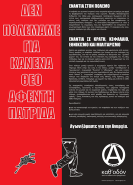 Για αυτό αγωνιζόμαστε και σε περίοδο "ειρήνης" και στην περίπτωση πολέμου ενάντια σε κάθε κράτος, απέναντι σε κάθε μορφή καταπίεσης και εκμετάλλευσης, χωρίς καμία υποταγή στην εθνική ενότητα. Προχωράμε σε αρνήσεις στράτευσης, συγκρουόμαστε με τον στρατό και την πολεμική βιομηχανία. Σαμποτάρουμε την προετοιμασία του πολέμου και τον εθνικό πόλεμο. Αρνούμαστε να αλληλοσκοτωθούμε για τα συμφέροντα των αφεντικών και την δόξα της πατρίδας. Συνεχίζουμε τους κοινωνικούς και ταξικούς αγώνες, ενάντια στον μιλιταρισμό, τη λεηλασία της φύσης, την πατριαρχία μέχρι την ολική απελευθέρωση.