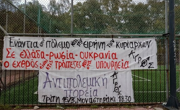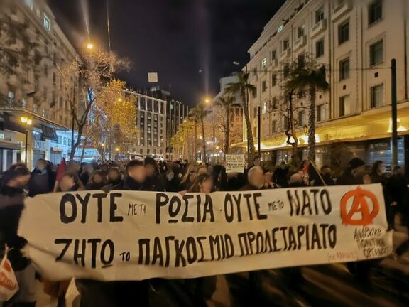 Να μην γίνουμε κρέας για τις οβίδες τον αφεντικών, να αντιπαλέψουμε τον μιλιταρισμό, να μπλοκάρουμε τον πόλεμο εδώ αλλά και παντού στον πλανήτη. Η Ελλάδα αποτελεί μέλος του ΝΑΤΟ και της ΕΕ και είναι βαθιά προσδεδεμένη στο άρμα του Ευρωατλαντισμού, υπεύθυνου για τόσες και τόσες εγκληματικές επεμβάσεις τα τελευταία και όχι μόνο χρόνια. Επίσης, η ανανέωση της αμυντικής συνεργασίας Ελλάδας-ΗΠΑ με την αναβάθμιση της ΝΑΤΟϊκής βάσης της Σούδας και του ρόλου της στην ευρύτερη περιοχή, τη μεταφορά «ειδικών» όπλων στην αεροπορική βάση του Αράξου και την επέκταση των υφιστάμενων στρατιωτικών βάσεων σε μια σειρά περιοχών της χώρας, συμπεριλαμβανομένων της Λάρισας, του Στεφανοβικείου και της βάσης ελικοπτέρων στην Αλεξανδρούπολη, αποτελεί ένα ακόμα δείγμα επικύρωσης και διεύρυνσης των σχέσεων του ελληνικού και αμερικάνικου κράτους, επιβεβαίωσης της πρόσδεσης της εγχώριας αστικής τάξης στο άρμα συμφερόντων της κυρίαρχης διεθνούς πολιτικο-οικονομικής ελίτ και ενίσχυσης του ρόλου του ελληνικού κράτους στη νευραλγική περιοχή των Βαλκανίων και της Ανατολικής Μεσογείου. Έτσι σήμερα το υποπόδιο του Δυτικού Συνασπισμού που φέρει τον τίτλο του πρωθυπουργού της χώρας, ξεκίνησε αποστολές πολεμικού υλικού με C-130, ο κρετινισμός του μπορεί να γραφτεί με ανεξίτηλα γράμματα στην ιστορία της χώρας. Είναι καθήκον να αγωνιστούμε ενάντια στην επίσημη εμπλοκή της χώρας στον πόλεμο. Ωστόσο, αυτή η θέση δεν αποτελεί σε καμία περίπτωση το υποκριτικό πρόσχημα για την έμμεση υποστήριξη οποιουδήποτε εξουσιαστικού στρατοπέδου. Με την ίδια πίστη στις αρχές του προλεταριακού διεθνισμού που καλούμε σε αντιπολεμική κινητοποίηση εδώ ενάντια σε όλους τους στρατιωτικούς συνασπισμούς με την ίδια ένταση υποστηρίζουμε τις αντιπολεμικές συγκεντρώσεις στη Ρωσία και όπου αλλού οι άνθρωποι καταλαβαίνουν ότι το πεδίο του πολέμου αποτελεί το σφαγείο των αδύναμων. Γιατί εμείς μπορεί να δρούμε σε αυτό το κομμάτι γης, όμως ο εχθρός είναι παντού είναι το κράτος και ο παγκόσμιος καπιταλισμός σε όλες τις εκδοχές του.