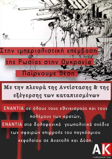 Σ' αυτήν λοιπόν την συνθήκη, όλοι εμείς που ανήκουμε στην βάση της κοινωνικής πυραμίδας, που δυσκολευόμαστε να τα βγάλουμε πέρα καθώς το κόστος ζωής μας ανεβαίνει συνεχώς, που βλέπουμε τις ζωές μας να απειλούνται από τους ανταγωνισμούς των ισχυρών, οφείλουμε να δράσουμε ώστε να σταματήσουμε αυτόν τον πόλεμο, όπως και όλους τους διακρατικούς πολέμους. Να γίνουμε η άμμος στα γρανάζια της πολεμικής τους μηχανής, ώστε να μη χυθεί άλλο αίμα καταπιεσμένων για τα συμφέροντα των εκμεταλλευτών τους. Να πάρουμε δύναμη από τους χιλιάδες αγωνιζόμενους στη Ρωσία, που βγήκαν στους δρόμους ενάντια στην εκεί ρητορική, αψηφώντας το σκληρό καταπιεστικό καθεστώς για όσες αντιστέκονται, και να αποδομήσουμε το κυρίαρχο νατοϊκό αφήγημα που επικρατεί εδώ - χωρίς παράλληλα να έχουμε καμία αυταπάτη περί «ήπιου» ρώσικου καπιταλισμού. Να δηλώσουμε ξεκάθαρα ότι δε θα γίνουμε τα στρατιωτάκια τους στις παρτίδες σκάκι που στήνουν για να αυξήσουν τη δύναμή τους, και να δράσουμε στο δικό μας πεδίο, απέναντι στην ελληνική αστική τάξη και το ελληνικό κράτος. Ο εχθρός βρίσκεται μέσα στην ίδια μας τη χώρα, και είναι ταξικό και διεθνιστικό μας καθήκον να μην επιτρέψουμε τη συμμετοχή του σε ακόμα έναν πόλεμο μέσα από τις τάξεις του ΝΑΤΟ. Να μπλοκάρουμε την αποστολή όπλων και τη χρήση των δεκάδων βάσεων για τη μεταφορά στρατιωτών και πολεμικού εξοπλισμού. Να αγωνιστούμε για το κλείσιμο όλων των βάσεων και να σαμποτάρουμε την ίδια τη συμμετοχή της Ελλάδας στη δολοφονική μηχανή του ΝΑΤΟ, που ευθύνεται για το αίμα εκατομμυρίων σε δεκάδες επεμβάσεις σε κάθε γωνιά του πλανήτη.