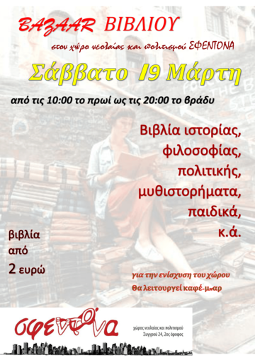 Ο χώρος Νεολαίας και Πολιτισμού Σφεντόνα στη Θεσσαλονίκη, σας προσκαλεί στο Παζάρι Βιβλίου που διοργανώνει το Σάββατο 19 Μάρτη, από τις 10:00 το πρωί ως τις 20:00 το βράδυ. Στο χώρο της Συγγρού 24 θα βρείτε βιβλία ιστορίας, φιλοσοφίας, πολιτικής, μυθιστορήματα, κ.ά, από 2 ευρώ. Ποιοτικά βιβλία, αλλά και έργα τέχνης που δωρίζουν με μεράκι οι συναγωνιστές και οι φίλοι της Σφεντόνας. Άνθρωποι κάθε ηλικίας, νέοι, εργαζόμενοι, άνεργοι, συνταξιούχοι, θα έχουμε την ευκαιρία να ανταμώσουμε σε πείσμα των καιρών, προάγοντας το βιβλίο, την συναγωνιστική επαφή, την αλληλεγγύη. Τα έσοδα θα διατεθούν για την οικονομική ενίσχυση του χώρου. Καθ' όλη τη διάρκεια της ημέρας θα λειτουργεί καφέ-μπαρ. Θα τηρηθούν όλα τα μέτρα υγειονομικής προστασίας.