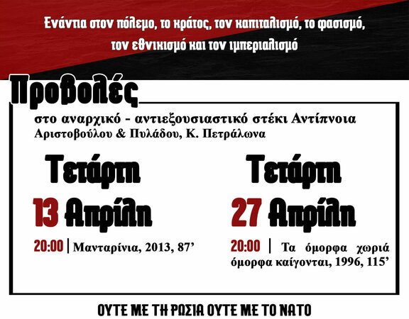 Ενάντια στον Πόλεμο | Προβολές Τετάρτη 13 & 27 Απρίλη