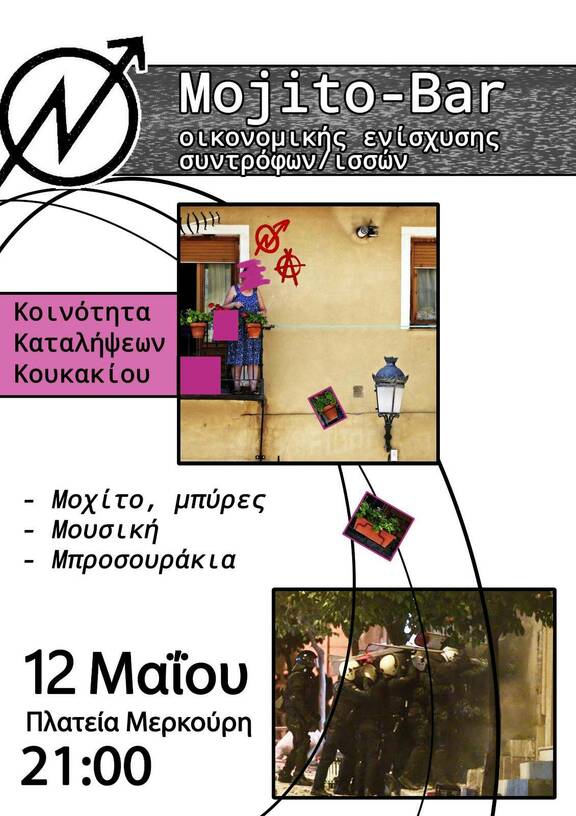 Την Πέμπτη 12 Μαΐού από τις 21:00 και μετά θα πραγματοποιηθεί mojito bar στην Πλ.Μερκούρη στα Πετράλωνα. Θα υπάρχει τραπέζι με μπροσουράκια από το αρχείο της εκκενωμένης Παναιτωλίου 21 και κουτί για την οικονομική ενίσχυση τετράποδου.