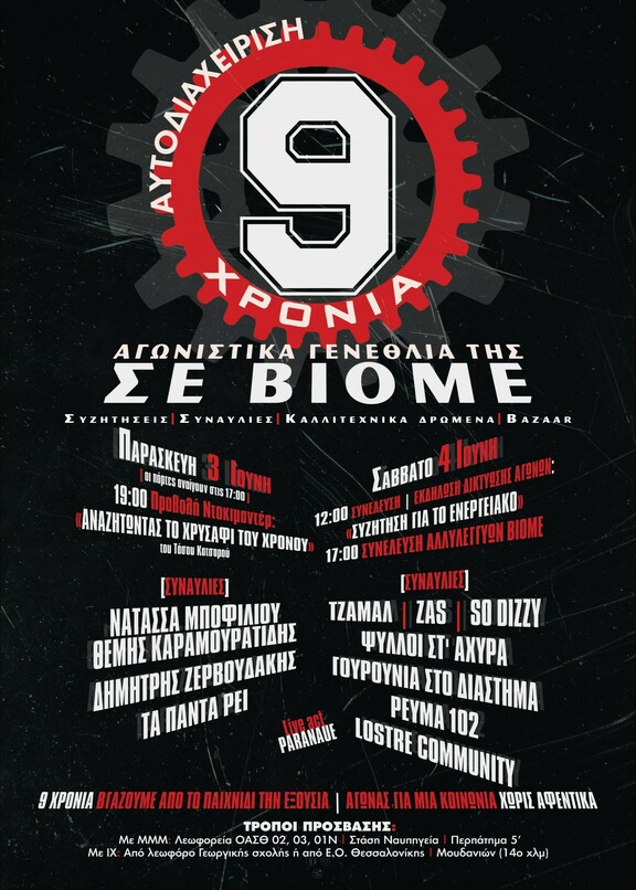 Μετά από δύο χρόνια απουσίας της καθιερωμένης γιορτής, σας καλούμε στις 3 & 4 Ιούνη, για να (ξανα)γνωριστούμε, να συζητήσουμε, να γιορτάσουμε τα 9 χρόνια αυτοδιαχείρισης του εργοστασίου, 9 χρόνια για μια κοινωνία χωρίς αφεντικά!