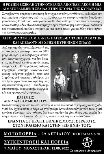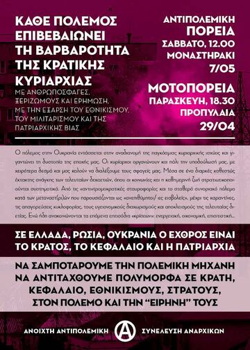 «Ο πόλεμος στην Ουκρανία εντάσσεται στην αναδιανομή της παγκόσμιας κυριαρχικής ισχύος και γιγαντώνει τη δυστοπία της εποχής μας. Οι κυρίαρχοι οργανώνουν και πάλι την υποδούλωση μας, με χειρότερα δεσμά και μας καλούν να διαλέξουμε τους σφαγείς μας. Μέσα σε ένα διαρκές καθεστώς έκτακτης ανάγκης των τελευταίων δεκαετιών, όπου οι κοινωνίες και η καθημερινή ζωή στρατιωτικοποιούνται συστηματικά. Από τις "αντι"τρομοκρατικές σταυροφορίες και τον σταθερό συνοριακό πόλεμο κατά των μεταναστ(ρι)ών που παρουσιάζονται ως "ανεπιθύμητοι/-ες εισβολείς", μέχρι τις καραντίνες, τις απαγορεύσεις κυκλοφορίας, τους υγειονομικούς διαχωρισμούς και αποκλεισμούς της τελευταίας διετίας. Ενώ ήδη ανακοινώνονται τα επόμενα επεισόδια "κρίσεων": ενεργειακή, οικονομική, επισιτιστική.» (Ανοιχτή Αντιπολεμική Συνέλευση Αναρχικών)