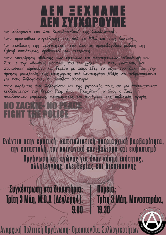 3 χρόνια έχουν περάσει χωρίς τον Ζακ. Αύριο φτάνουμε στην ώρα της απόφασης, μια στιγμή που φάνταζε μακρινή και ήταν επίπονη διαδικασία. Δε δολοφονήθηκε μονάχα μια φορά από τον κοσμηματοπώλη, τον μεσίτη και τους 4 αστυνομικούς. Την Ζάκι την δολοφονούσαν επί 43 ολόκληρους μήνες. Από τη στιγμή που του πέρασαν χειροπέδες στο άψυχο σώμα του την ημέρα της 21ης Σεπτεμβρίου ξεκίνησε ένα λιντσάρισμα το οποίο αποτυπώνει όλον τον κανιβαλισμό που καθόλου καλά δεν ξέρει να κρύβει η κοινωνία. Η τοξικοφοβία, η ομοφοβία και ο ρατσισμός των ΜΜΕ βρίσκονταν σε prime time ταΐζοντας μίσος και φασισμό τους τηλεθεατές. Ο Ζακ ήταν άνθρωπος «παρείσακτος», άρα του άξιζε αυτό που έπαθε. Ο κοσμηματοπώλης προστάτευε το μαγαζί του από το «πρεζάκι». Γρήγορα, όμως, σηκώθηκε ένα μεγάλο κύμα συμπαράστασης για να διεκδικήσει δικαίωση για το πρόσωπο του Ζακ και την οικογένειά του το οποίο έφτασε να μετράει χιλιάδες σε όλη την Ελλάδα. Από την πρώτη μέρα βρισκόμαστε απέναντι στον κοινωνικό κανιβαλισμό. Βρεθήκαμε έξω από τα δικαστήρια όταν ύστερα από δύο χρόνια ξεκίνησε η δίκη με τεράστια καθυστέρηση. Ήμασταν όλα εκεί όταν ακούγαμε μέσα στη δικαστική αίθουσα να δικάζεται η υπόληψη και η προσωπικότητα του θύματος και όχι οι θύτες. Ύστερα από την ποινή- χάδι που πρότεινε ο εισαγγελέας δεν υπήρχε άλλος δρόμος από το να παλέψουμε μέχρι τέλους για να δικαιωθεί ο Ζακ Κωστόπουλος/ η ZackieOh! και η οικογένειά του. Να αλλάξουν τώρα οι κατηγορίες και να καταδικαστούν όλοι οι δολοφόνοι! Μέχρι να μην υπάρξει κανένα άλλο θύμα!