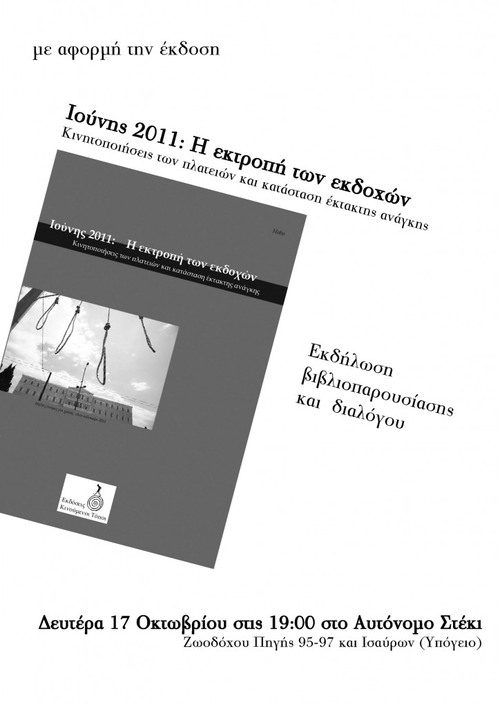 Με αφορμή την έκδοση της μπροσούρας Ιούνης 201: Η εκτροπή των εκδοχών (κινητοποιήσεις των πλατειών και κατάσταση έκτακτης ανάγκης), θα πραγματοποιηθεί εκδήλωση βιβλιοπαρουσίασης και διαλόγου σχετικά με τα ζητήματα που θέτει, στο αυτόνομο στέκι (Ζωοδόχου Πηγής 96 και Ισαύρων, Εξάρχεια), την Δευτέρα 17 Οκτωμβρίου, στις 7.