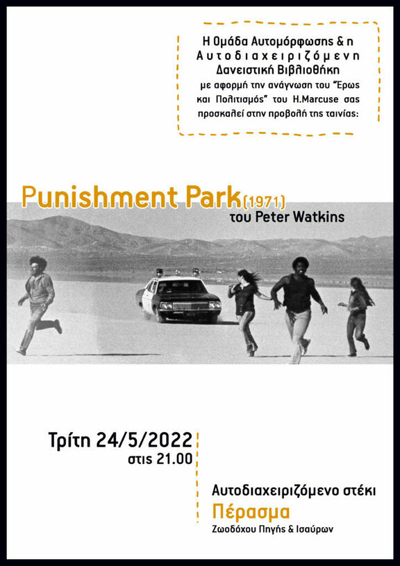 Την Τρίτη 24 Μαΐου 2022 στις 21.00 η ομάδα Αυτομόρφωσης & Βιβλιοθήκης με αφορμή την ενασχόληση της με το έργο του Herbert Marcuse σας προσκαλεί να παρακολουθήσουμε μαζί την ταινία Punishment Park (1971) σε σκηνοθεσία Peter Watkins. Θα ακολουθήσει χαλαρή συζήτηση - κους κους - ψιλοκουβέντα - κύκλοι - πηγάδια και πηγαδάκια. Φέρτε ζακέτα για το εξωτικό - δροσερό μας υπόγειο!