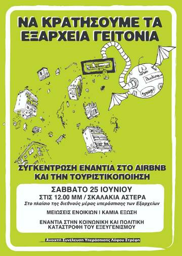 Στο πλαίσιο της διεθνούς μέρας υπεράσπισης των Εξαρχείων καλούμε σε ΣΥΓΚΕΝΤΡΩΣΗ ΕΝΑΝΤΙΑ ΣΤΟ AIRBNB ΚΑΙ ΤΗΝ ΤΟΥΡΙΣΤΙΚΟΠΟΙΗΣΗ. Σάββατο 25 Ιουνίου στις 12.00μμ, σκαλάκια Αστέρα