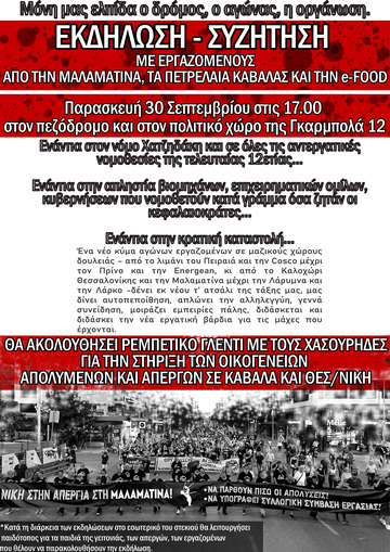 Εκδήλωση-Συζήτηση με εργαζομένους από την Μαλαματίνα, τα Πετρέλαια Καβάλας, την E-food