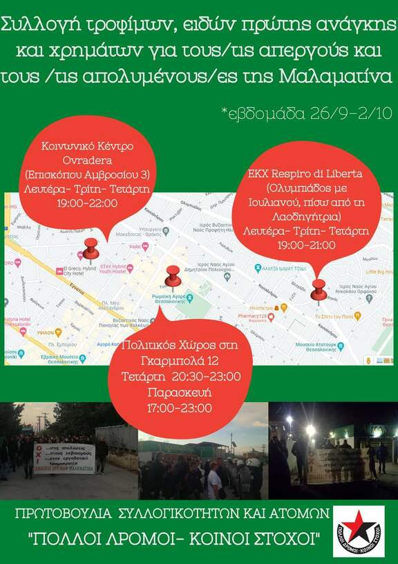 Ως μία πρώτη δράση έμπρακτης και άμεσης στήριξης και αλληλεγγύης θα γίνεται συλλογή τροφίμων, καθώς και οικονομική ενίσχυσης του αγώνα των απεργών στο εργοστάσιο στη "Μαλαματίνα" σε διάφορους κοινωνικούς και πολιτικούς χώρους με στόχο να παραδοθούν μέχρι την Κυριακή 02/10.