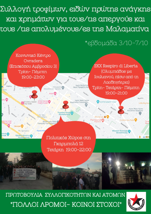 Ως μία πρώτη δράση έμπρακτης και άμεσης στήριξης και αλληλεγγύης θα γίνεται συλλογή τροφίμων, καθώς και οικονομική ενίσχυσης του αγώνα των απεργών στο εργοστάσιο στη "Μαλαματίνα" σε διάφορους κοινωνικούς και πολιτικούς χώρους με στόχο να παραδοθούν μέχρι την Κυριακή 02/10.