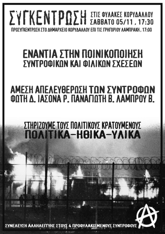 Καλούμε σε συγκέντρωση αλληλεγγύης έξω από τις φυλακές Κορυδαλλού το Σάββατο 5/11 στις 17:30