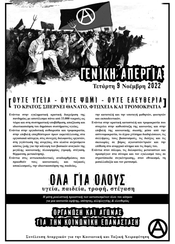 Απέναντι στο σύγχρονο ολοκληρωτισμό ήρθε για ακόμη μια φορά η στιγμή να προτάξουμε την αξιοπρέπεια, την αντίσταση, την αλληλεγγύη. Απέναντι στην ακρίβεια, την υποτίμηση της ζωής μας, τη φτωχοποίηση και την καταπίεση, απέναντι σε πολέμους και εθνικισμό, απέναντι σε κράτη και αφεντικά που καταδυναστεύουν τις ζωές μας να εντείνουμε τους κοινωνικούς και ταξικούς αγώνες. Να σταθούμε όλοι και όλες μαζί στο δρόμο και τους αγώνες της κοινωνικής αντίστασης και της ταξικής αλληλεγγύης. Να αγωνιστούμε συλλογικά και από τα κάτω ενάντια στους δυνάστες μας, να δυναμώσουμε και να περιφρουρήσουμε τις κοινωνικές και ταξικές αντιστάσεις που βρίσκονται στο στόχαστρο της καταστολής και να οργανώσουμε νέες. Χωρίς να έχουμε αυταπάτες για τον ρόλο των θεσμών, χωρίς να προσφέρουμε καμία συναίνεση στη διαχείριση της ζωής μας, να μην κάνουμε ούτε βήμα πίσω σε αυτά που έχουμε κατακτήσει και που διαρκώς διακυβεύονται και να κάνουμε τους χώρους που εργαζόμαστε, φοιτούμε και ζούμε εστίες αντίστασης και αγώνα. Απέναντι στον πόλεμο, που αποτελεί μονόδρομο σωτηρίας για το κρατικό και καπιταλιστικό σύστημα, απέναντι στο σχέδιο αλληλοεξόντωσης των εκμεταλλευόμενων και καταπιεσμένων, απέναντι στον εθνικισμό, τον φασισμό και τον ιμπεριαλισμό η μόνη ελπίδα είναι η διεθνιστική αλληλεγγύη μεταξύ των λαών, η οργανωμένη αντεπίθεση των από τα κάτω. Μόνο η συνολική ανατροπή του κράτους και του καπιταλισμού, η κοινωνική απαλλοτρίωση του πλούτου που εμείς οι ίδιοι παράγουμε και απομυζά μια κάστα εξουσιαστών και η οργάνωση του αγώνα για την Κοινωνική Επανάσταση για έναν κόσμο κοινοκτημοσύνης, ειρήνης, αλληλεγγύης και ελευθερίας μπορούν να δικαιώσουν τους πόθους και τις πραγματικές ανάγκες των καταπιεσμένων και εκμεταλλευόμενων.