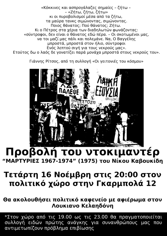 Την Τετάρτη 16 Νοεμβρίου στις 20.00 στον πολιτικό χώρο στη Γκαρμπολά 12 θα πραγματοποιηθεί το ντοκιμαντέρ του Νίκου Καβουκίδη "Μαρτυρίες 1967-1974", ενώ θα ακολουθήσει πολιτικό καφενείο με αφιέρωμα στον Λουκιανό Κελαηδόνη.