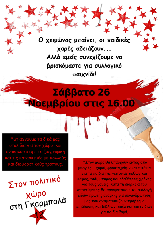 *Στον χώρο θα υπάρχουν εκτός από μπογιές... χυμοί, φρούτα,μάφιν και πιτάκια για τα παιδιά της γειτονιάς καθώς και καφές, τσάι, μπύρες και ελεύθερος χρόνος για τους γονείς. Κατά τη διάρκεια του απογεύματος θα πραγματοποιείται συλλογή ειδών πρώτης ανάγκης για συνανθρώπους μας που αντιμετωπίζουν πρόβλημα επιβίωσης και βιβλίων, παζλ και παιχνιδιών για παιδιά Ρομά.