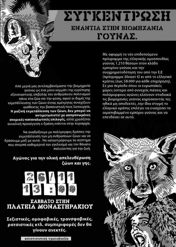 Καλούμε σε συγκέντρωση στις 26/11 στην πλατεία Μοναστηρακίου ενάντια στην βιομηχανία γούνας, με αφορμή την προσπάθεια στήριξης της αιματοβαμμένης αυτής πρακτικής από το ελληνικό κράτος και την Ε.Ε.