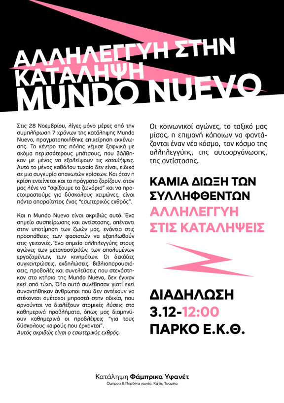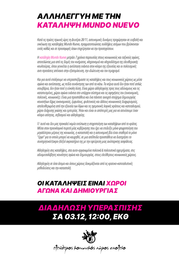 Σε συνέχεια της μαζικής διαδήλωσης το απόγευμα της εκκένωσης της κατάληψης Mundo Nuevo, δηλώνουμε τη στήριξη και την αλληλεγγύη μας στους συντρόφους και τις συντρόφισσες της κατάληψης και καλούμε στην πορεία υπεράσπισής της στην αστυνομοκρατούμενη πλέον γειτονιά της Φιλίππου.