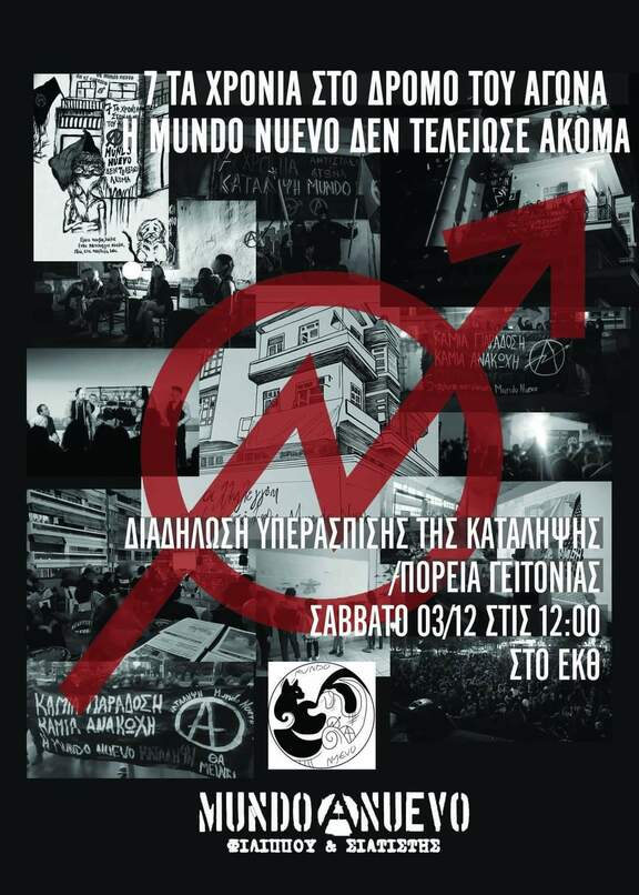 Η κατάληψη Mundo Nuevo μετράει 7 χρόνια παρουσίας στους κοινωνικούς και ταξικούς αγώνες, αποτελώντας μια από τις δομές του κινήματος, κληρονομιά και κληροδότημα της ελευθεριακής κουλτούρας, όπου γεννιέται η αντίσταση ενάντια στον κόσμο της εξουσίας και οι πολιτισμικές αντι-προτάσεις απέναντι στην εξατομίκευση, την ιδιώτευση και τον τεμαχισμό.