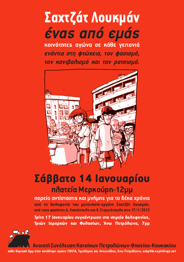 Σάββατο 14 Ιανουαρίου 2023 - πλατεία Μερκούρη - 12μμ πορεία αντίστασης και μνήμης για τα δέκα χρόνια από τη δολοφονία του μετανάστη-εργάτη Σαχτζάτ Λουκμάν, από τους φασίστες Δ. Λιακόπουλο και Χ. Στεργιόπουλο στις 17/1/2013, στην Τριών Ιεραρχών, στα Άνω Πετράλωνα