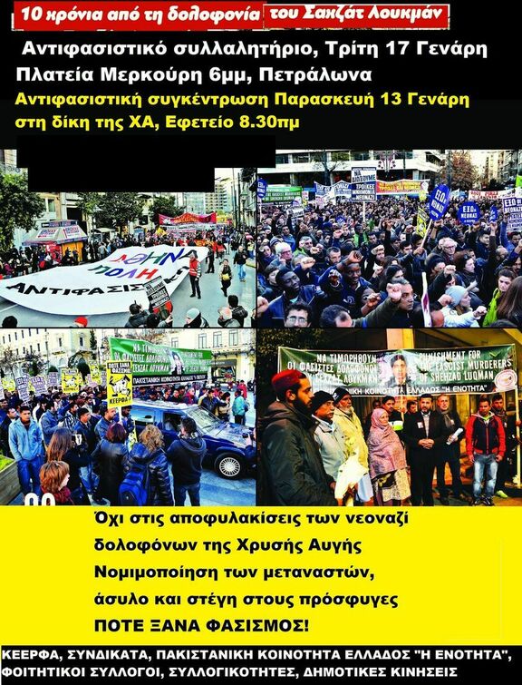 On January 17, 2013, it will be ten years since the brutal murder of the migrant worker Shahzat Luqman in Petralona, with seven stab wounds by nazis of Golden Dawn Liakopoulos and Stergiopoulos. The fascists chased him with a motorcycle while he was commuting to work by bicycle from his home in Peristeri to the laiki market in Petralona. Eight months later, the nazis of Golden Dawn murdered Pavlos Fyssa in Keratsini. The anti-fascist outburst of anger put an end to Golden Dawn's immunity.