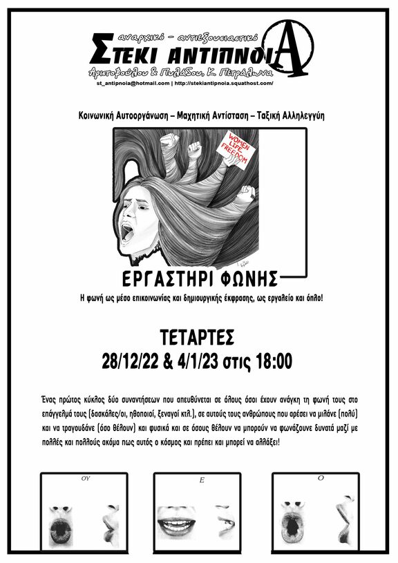 Ένας πρώτος κύκλος δύο συναντήσεων που απευθύνεται σε όλους όσοι έχουν ανάγκη τη φωνή τους στο επάγγελμά τους (δασκάλες/οι, ηθοποιοί, ξεναγοί κτλ.), σε αυτούς τους ανθρώπους που αρέσει να μιλάνε (πολύ) και να τραγουδάνε (όσο θέλουν) και φυσικά και σε όσους θέλουν να μπορούν να φωνάζουνε δυνατά μαζί με πολλές και πολλούς ακόμα πως αυτός ο κόσμος και πρέπει και μπορεί να αλλάξει!