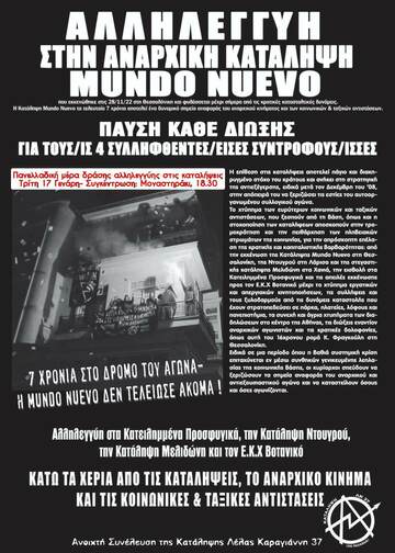 Τα ξημερώματα της 28ης Νοέμβρη ισχυρές αστυνομικές δυνάμεις εισβάλλουν και εκκενώνουν την κατάληψη Mundo Nuevo στη Θεσσαλονίκη. Μέσα από το κτίριο συλλαμβάνουν 4 συντρόφους/ισσες ενώ προσαγάγουν και τρεις ακόμα από τους γύρω δρόμους, οι οποίοι αφήνονται ελεύθεροι μετά από λίγη ώρα. Άμεσα πραγματοποιείται συγκέντρωση υπεράσπισης της κατάληψης που στέκεται δυναμικά απέναντι από τον αστυνομικό φραγμό και το ίδιο απόγευμα πραγματοποιείται μαζική πορεία στην πόλη της Θεσσαλονίκης που διαδηλώνει σε αλληλεγγύη με τη Mundo Nuevo και ενάντια στην κατασταλτική μανία του κράτους απέναντι στους αναρχικούς, στις καταλήψεις και τους αυτοοργανωμένους και αδιαμεσολάβητους κοινωνικούς και ταξικούς αγώνες. Η στοχοποίηση των συντρόφων/ισσών συνεχίζεται και τις επόμενες ημέρες με παρακολουθήσεις καθώς και επιπλέον διώξεις, όπως το Σάββατο 3 Δεκέμβρη, που μετά τη λήξη καλεσμένης πορείας αλληλεγγύης στην κατάληψη, συλλαμβάνεται σύντροφος στον οποίο αποδίδονται κατηγορίες πάνω σε σαθρά στοιχεία. Παράλληλα και ενώ η αστυνομική παρουσία στη γειτονιά παραμένει έντονη γύρω από την κτήριο, ξεκινούν οι εργασίες σφραγίσματός του με διπλές λαμαρίνες, καταστρέφεται το εσωτερικό του προκειμένου να αχρηστευθεί με την αφαίρεση των σωλήνων ύδρευσης και των καλωδίων της ΔΕΗ και εγκαθίσταται συναγερμός και κάμερες.