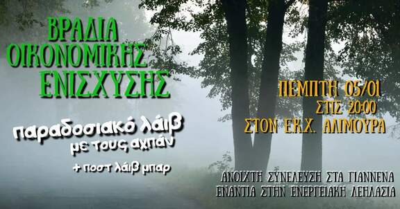 Παραδοσιακό λάιβ με τους Αχπάν για την οικονομική ενίσχυση της Ανοιχτής Συνέλευσης ενάντια στην Ενεργειακή Λεηλασία. Μαζευόμαστε από τις 8μ.μ. να γλεντήσουμε μαζί, με μουσικές του τόπου μας και άλλων, κοντινών και μακρινών.