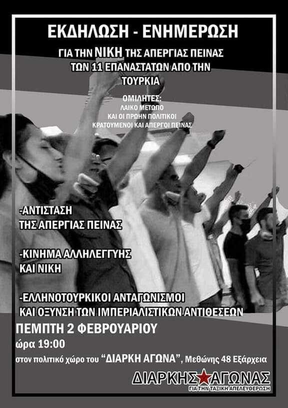 ΕΚΔΗΛΩΣΗ -ΕΝΗΜΕΡΩΣΗ για τη νίκη της απεργίας πείνας των 11 επαναστατών από την Τουρκία.
