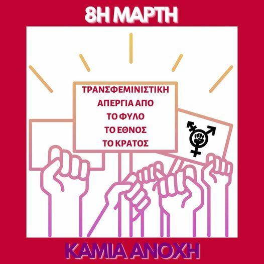 Απεργούμε από το φύλο κι από την εκπλήρωση των ρόλων και της θέσης του να είσαι γυναίκα ή θηλυκότητα, κουήρ ή τρανς άτομο. Αρνούμαστε να υπηρετήσουμε τα πατριαρχικά και ετεροκανονικά μοτίβα που μας επιβάλλονται καθημερινά από το έθνος που απαιτεί να ορίζει τα σώματά μας, που καθιστά την ορμονοληψία για τα trans αδέλφια μας κοστοβόρα, που νομοθετεί την υποχρεωτική συνεπιμέλεια, που εκτρέφει και προστατεύει βιαστές, κακοποιητές και μαστροπούς.