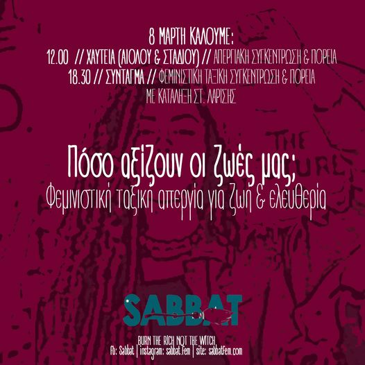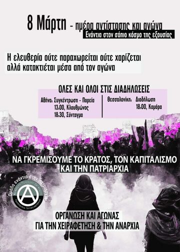 Παρα τις προσπαθειες κρατους και κεφαλαιου να αποπολιτηκοποιησουν και να εμπορευματοποιησουν τον συμβολισμο της 8η μαρτη ο οποιος εχει ξεκαθαρα αντιπατριαρχικα,αντιεξουσιαστικα και ταξικα χαρακτηριστικα, εμεις αντιλαμβανομαστε τον αγωνα εναντια στη πατριαρχια ως εναν αγωνα συνεχη και μαχητικο εξω απο τα ορια του θεσμικου φεμινισμου και της δημοκρατιας. Ετσι και αλλιως , η συγκεκριμενη μερα δεν ειναι γιορτη , αλλα ενα σημειο αναφορας ωστε να στεκομαστε συλλογικα και μαχητικα στο δρομο. Γι αυτο και εμεις στηριζουμε τις απεργιακες συγκεντρωσεις και την πορεια. ΕΝΑΝΤΙΑ ΣΕ ΚΑΡΤΟΣ,ΚΑΠΙΤΑΛΙΣΜΟ,ΠΑΤΡΙΑΡΧΙΑ