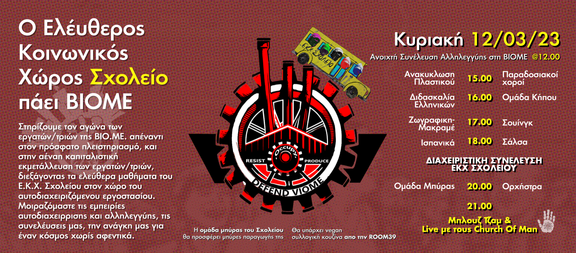 Με αφορμή τον πρόσφατο πλειστηριασμό της ΒΙΟΜΕ, και με βάση όλα όσα μας συνδέουν - αλληλεγγύη, αυτοοργάνωση, αμεσοδημοκρατικές διαδικασίες και μία ζωή χωρίς αφεντικά και αυθεντίες - οργανώνουμε τα ελεύθερα μαθήματά μας στο κατειλημμένο εργοστάσιο της ΒΙΟΜΕ. Στοχεύουμε εμείς, τα ίδια τα άτομα του Σχολείου, αλλά και τα άτομα της πόλης, να γνωρίσουμε μαζί τους αγώνες και την πραγματικότητα του μοναδικού αυτοδιαχειριζομένου εργοστασίου στην Ελλάδα.