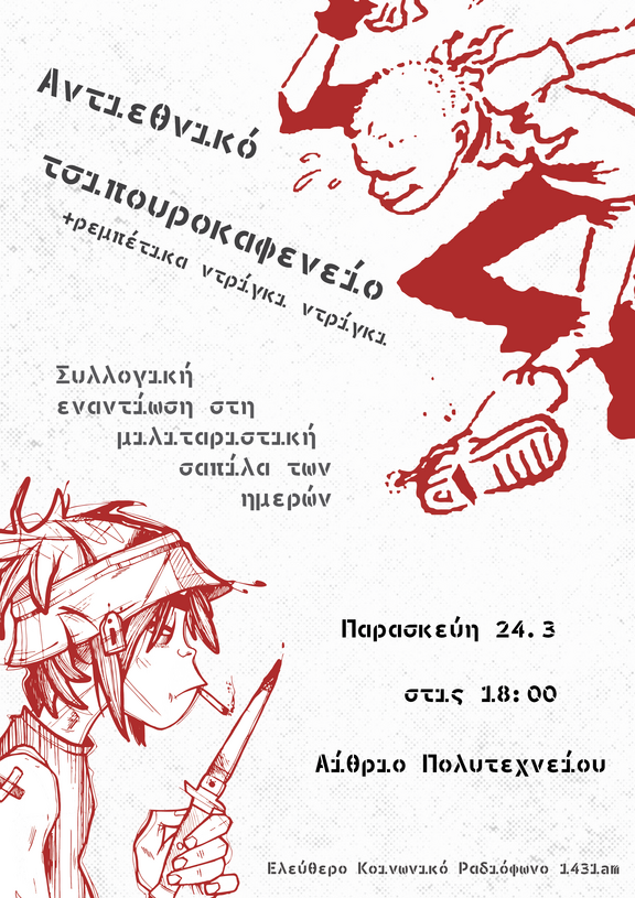 Συλλογική εναντίωση στη μιλιταριστική σαπίλα των ημερών, μαζευόμαστε σαν θείες μετά την παρέλαση, με τσίπουρα, μπύρες, καφέδες και *με αισιοδοξία* βίγκαν μεζέδες και ψιψιψόνια για ένα άκρως αντιπαραγωγικό και αντιεθνικό άραγμα.