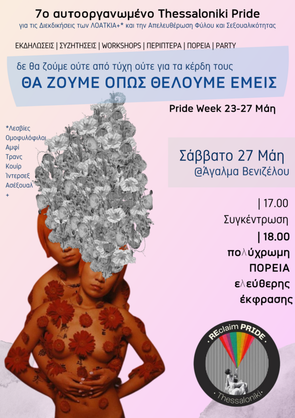 Η φετινή κεντρική εκδήλωση του 7ου αυτοοργανωμένου Thessaloniki Pride προσφέρει τον τόπο για να συναντηθούμε ως λοατκια+ και φεμινιστικό κίνημα και να κουβεντιάσουμε με τα υπόλοιπα κινήματα της πόλης. Να συζητήσουμε για τα σημεία, στα οποία οι διεκδικήσεις μας διασταυρώνονται σε ένα ορμητικό ποτάμι. Για τις υποχωρήσεις των επιμέρους κινημάτων στις μάχες που έδωσαν και στο πώς αυτές επηρέασαν όλα μας.