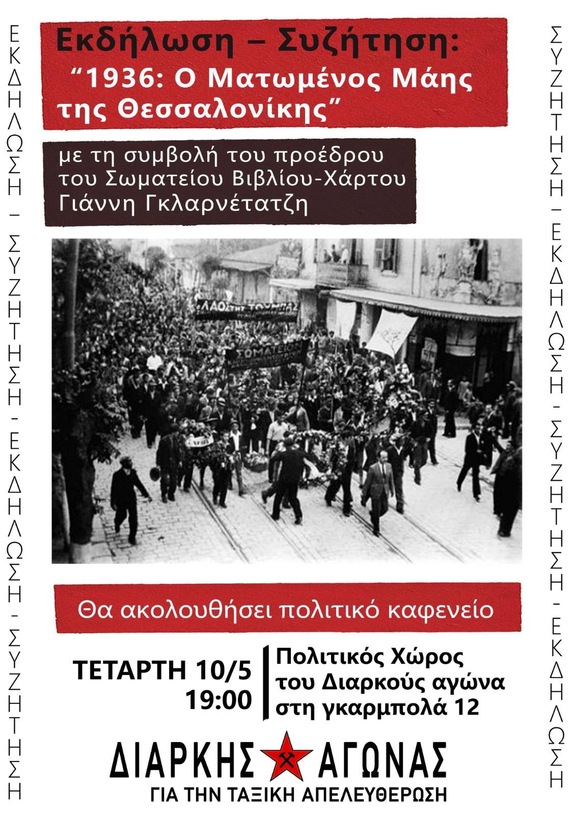 Ιστορική εκδήλωση με τίτλο "1936: Ο Μάης της Θεσσαλονίκης" με τον πρόεδρο του Σωματείου Υπαλλήλων Βίβλου-Χάρτου και ιστορικό Γιάννη Γκλαρνέτατζη.