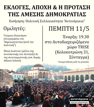 Σας καλούμε όλες και όλους στη δημόσια εκδήλωση με τον τίτλο "Εκλογές, αποχή & η πρόταση της άμεσης δημοκρατίας"