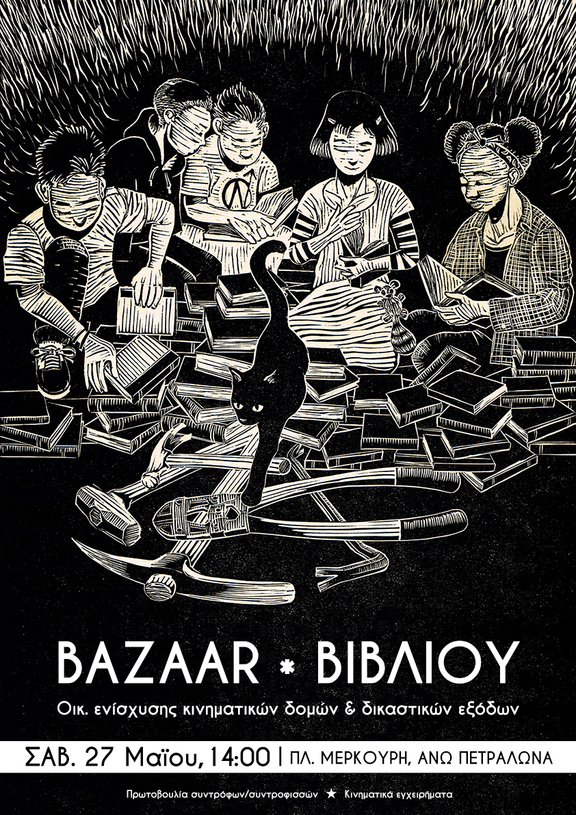 Το Σάββατο 27 Μαϊου, από τις 14:00 ως τις 18:00, θα πραγματοποιηθεί στην Πλατεία Μερκούρη, (Άνω Πετράλωνα) bazaar βιβλίου για δικαστικά έξοδα και τη στήριξη κινηματικών δομών.