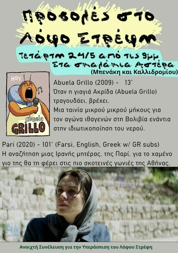 Θα δούμε το "Abuela Grillo" μια ταινία μικρού μήκους για τον αγώνα κατά της ιδιωτικοποίησης του νερού και το «Pari», όπου οι γονείς ενός εξαφανισμένου Ιρανού επαναστάτη έρχονται Αθήνα να τον ψάξουν.