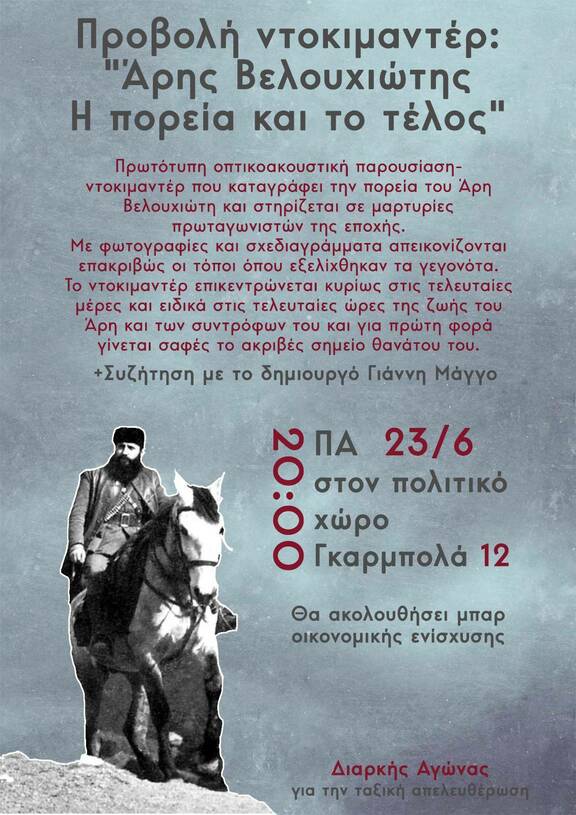 Προβολή: "Άρης Βελουχιώτης: Η πορεία και το τέλος" + μπαρ οικονομικής ενίσχυσης