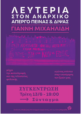 ΑΜΕΣΗ ΑΠΕΛΕΥΘΕΡΩΣΗ ΤΟΥ ΑΝΑΡΧΙΚΟΥ ΓΙΑΝΝΗ ΜΙΧΑΗΛΙΔΗ ΠΟΥ ΒΡΙΣΚΕΤΑΙ ΣΕ ΑΠΕΡΓΙΑ ΠΕΙΝΑΣ ΑΠΟ ΤΙΣ 12/5 ΚΑΙ ΣΕ ΑΠΕΡΓΙΑ ΔΙΨΑΣ ΑΠΟ ΤΙΣ 10/6