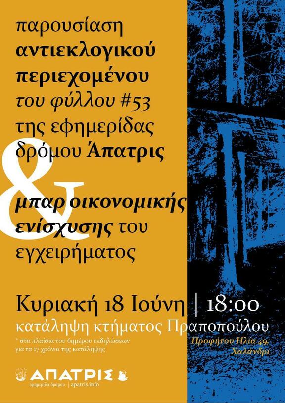 Την Κυριακή 18 Ιούνη, στις 18:00, στην κατάληψη του κτήματος Πραποπούλου θα πραγματοποιηεί παρουσίαση του αντιεκλογικού περιεχομένου του φύλλου #53 της εφημερίδας δρόμου Άπατρις.