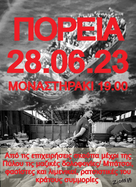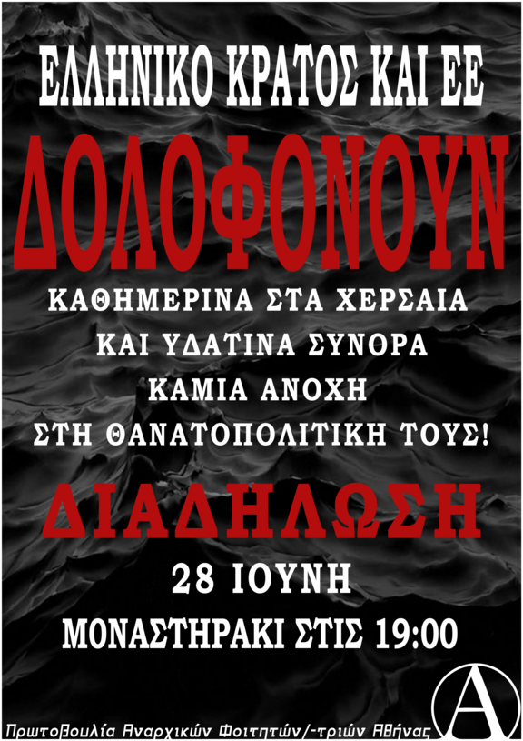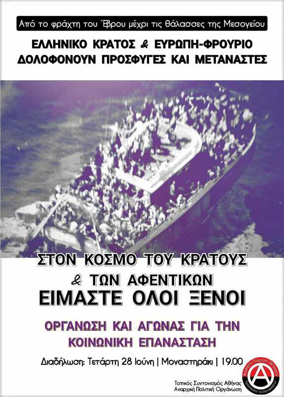 Στις 14 Ιούνη βυθίστηκε στα ανοιχτά της Πύλου ένα αλιευτικό σκάφος στο οποίο επέβαιναν περισσότεροι από 700 πρόσφυγες και μετανάστες με σκοπό να περάσουν από τη Λιβύη στην Ιταλία. Από το ναυάγιο επέζησαν 104 ενώ 80 ανασύρθηκαν νεκροί. Ο τεράστιος αριθμός των αγνοουμένων σε συνδυασμό με τους νεκρούς μετανάστες αποκαλύπτει το μέγεθος της εγκληματικής διαχείρισης του συμβάντος από το ελληνικό κράτος, με δεδομένο οτι οι ελληνικές αρχές είχαν ειδοποιηθεί αρκετές ώρες πριν για τον κίνδυνο, στον οποίο βρίσκονταν οι επιβαίνοντες του σκάφους αλλά και από το γεγονός οτι μαρτυρίες προσφύγων και μεταναστών που επέζησαν από το ναυάγιο αναφέρουν πως το λιμενικό επιχείρησε να ρυμουλκήσει το σκάφος για να το απομακρύνει από την χωρική αρμοδιότητα διάσωσης του ελληνικού κράτους, με αποτέλεσμα αυτό να βυθιστεί και η πλειοψηφία των επιβαινόντων να μην προλάβει να βγει από τα χαμηλότερα επίπεδα του σκάφους, όπως πολλές μητέρες με τα παιδιά τους. Η αντιμεταναστευτική και δολοφονική πολιτική του ελληνικού κράτους και της Ευρώπης- φρούριο δεν είναι αποκομμένη από τη δολοφονία των μεταναστών στα ανοιχτά της Πύλου. Από την υπογραφή της συμφωνίας για την επέκταση του φράχτη στον Έβρο κατά 35χλμ, ώστε να "αναβαθμιστεί" περαιτέρω η θωράκιση των εξωτερικών συνόρων της Ελλάδας και κατ' επέκταση και της Ευρώπης, τις παράνομες επαναπροωθήσεις στο Αιγαίο και τους καθημερινούς πνιγμούς ανθρώπων, τα στρατόπεδα συγκέντρωσης προσφύγων και μεταναστών, όπου στοιβάζονται και φυλακίζονται άνθρωποι σε άθλιες συνθήκες χωρίς καμία ελευθερία μέχρι τα αστυνομικά πογκρόμ εναντίον τους μέσα στις πόλεις, οι πρόσφυγες και μετανάστες έρχονται αντιμέτωποι με την εγκληματική πολιτική του ελληνικού κράτους, που στόχο έχει την αποτροπή εισόδου στην χώρα, παίρνοντας φυσικά την επιλογή της δολοφονίας ανθρώπων που αναζητούν ένα καλύτερο μέλλον από αυτό του πολεμού, της φτώχειας και της ανελευθερίας. Μια συνθήκη στην οποία βρίσκονται χιλιάδες εκτοπισμένοι, εξαιτίας των πολέμων που διεξάγουν τα πλανητικά αφεντικά στις χώρες τους, για την εκμετάλλευση των φυσικών πόρων και τη διεύρυνση της σφαίρας επιρροής τους. Εξάλλου η καταδίκη εκατομμυρίων ανθρώπων στην εξαθλίωση, τη φτώχεια, τις αρρώστιες και τον ξεριζωμό αποτελεί την προϋπόθεση για την εξασφάλιση της υπερσυσσώρευσης του πλούτου στα χέρια των παγκόσμιων οικονομικών ελίτ.
