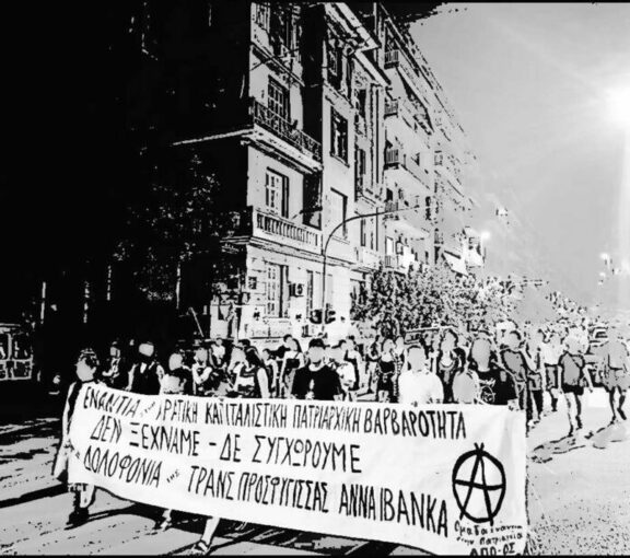Η άγρια δολοφονία της τρανς προσφύγισσας Άννας Ιβάνκοβα στον Αγ. Παντελεήμονα έρχεται να προστεθεί στην ατελείωτη λίστα των εγκλημάτων του κεφαλαίου, της πατριαρχίας, του ρατσισμού, ενός συστήματος που κρατάει στο περιθώριο, στιγματίζει και τελικά εξοντώνει τα φτωχά τρανς άτομα. Ενός συστήματος που οπλίζει καθημερινά τα χέρια γυναικοκτόνων, που όπως πρόσφατα στη Λάρισα πυροβολεί πισώπλατα πρόσφυγες, που πνίγει μετανάστ(ρι)ες στο Αιγαίο, που δολοφονεί στα εργασιακά κάτεργα. Κόντρα στα φασίζοντα- πατριαρχικά αφηγήματα περί «δολοφονημένου μετανάστη στον Αγ. Παντελεήμονα», όλες και όλοι εμείς τιμάμε την Άννα σαν μια νεκρή γυναίκα της τάξης μας.