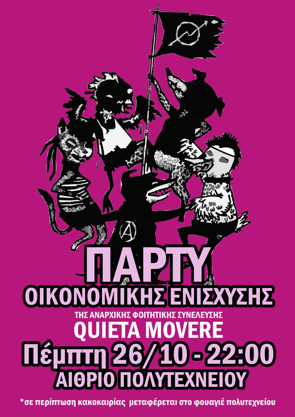 ΠΑΡΤΥ ΟΙΚΟΝΟΜΙΚΗΣ ΕΝΙΣΧΥΣΗΣ της Αναρχικής Φοιτητικής Συνέλευσης QUIETA MOVERE, Πέμπτη 26/10 - 22:00 - Αίθριο Πολυτεχνειου (σε περίπτωση κακοκαιρίας μεταφέρεται στο φουαγιέ πολυτεχνείου)