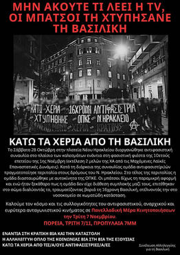Το Σάββατο 28 Οκτώβρη στην πλατεία Νέου Ηρακλείου διοργανώθηκε αντιφασιστική συναυλία στο πλαίσιο των καλεσμάτων ενάντια στη φασιστική φιέστα της 10ετούς επετείου της 1ης Νοέμβρη (εκτέλεση 2 μελών της ΧΑ από τις Μαχόμενες Λαϊκές Επαναστατικές Δυνάμεις). Κατά τη διάρκεια της συναυλίας ομάδα αντιφασιστ(ρι)ών πραγματοποίησε περιπολία στους δρόμους του Ν. Ηρακλείου. Στο τέλος της περιπολίας η ομάδα διασταυρώθηκε με αυτοκίνητα της ΟΠΚΕ. Οι μπάτσοι δίχως τη παραμικρή αφορμή και ενώ ήταν ξεκάθαρο πως η ομάδα δεν είχε διάθεση συμπλοκής μαζί τους, επιτέθηκαν στο σώμα διαλύοντάς το, τραυματίζοντας βαριά τη 16χρονη Βασιλική, στέλνοντάς την στο νοσοκομείο σε κωματώδη κατάσταση.