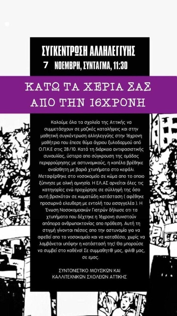 Στηρίζουμε τη συγκέντρωση αλληλεγγύης στη 16χρονη Βασιλική που καλεί το Συντονιστικό μουσικών και καλλιτεχνικών σχολείων Αττικής την Τρίτη 7/11, 11:30 στα Προπύλαια.