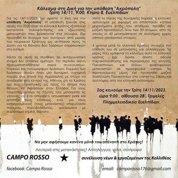 Για τις 14/11/2023 έχει οριστεί η δίκη για την υπόθεση "Ακρόπολη". Η υπόθεση ξεκινάει στις αρχές του 2020 όταν το ελληνικό Κράτος εξαπολύει εκστρατεία συκοφάντησης και εξώντοσης μεταναστών που βρίσκονται στα σύνορα. Είχε προγηθεί το άνοιγμα των συνόρων από μεριάς του τουρκικού Κράτους ως αντίποινα προς τη Δύση για το θάνατο δύο Τούρκων στρατιωτικών στο Ιντλίμπ.