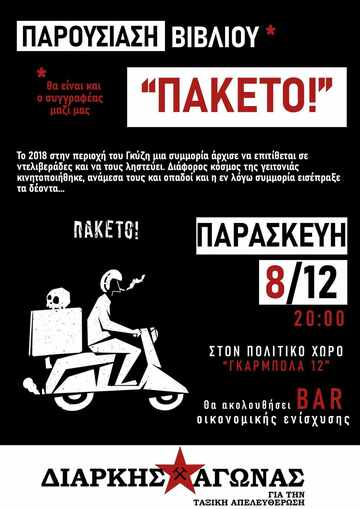 Παρουσίαση βιβλίου "ΠΑΚΕΤΟ!" με τον συγγραφέα στον πολιτικό χώρο του Διαρκή Αγώνα για την ταξική απελευθέρωση, στην Γκαρμπολά 12 την Παρασκευή 8 Δεκεμβρίου στις 20:00.