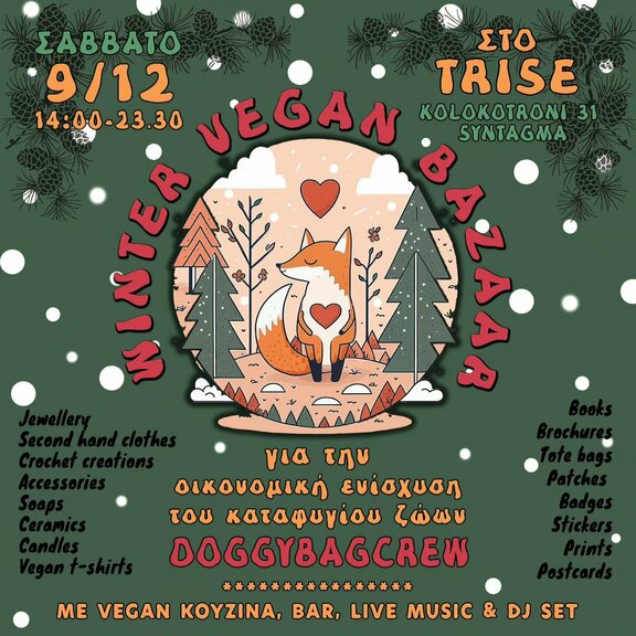 Το Σάββατο 9 Δεκεμβρίου θα πραγματοποιηθεί μπαζάρ οικονομικής ενίσχυσης του vegan καταφυγίου ζώων, DoggyBagCrew, από τις 14:00 έως τις 23:30 στον αυτοδιαχειριζόμενο κοινωνικό χώρο TRISE (Κολοκτρώνη 31, Σύνταγμα).