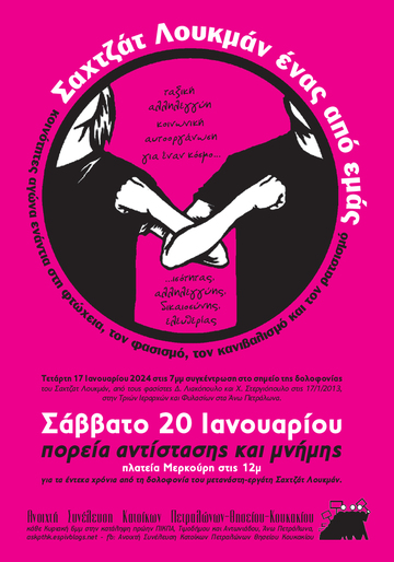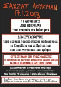 - Τετάρτη 17 Ιανουαρίου, 19:00 - Συγκέντρωση στο σημείο της δολοφονίας του Σαχζάτ Λουκμάν στα Άνω Πετράλωνα