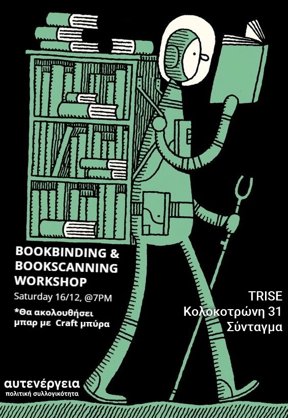 Εργαστήρι Βιβλιοδεσίας και σκαναρίσματος στο Τρισέ (Κολοκοτρώνη 31, Σύνταγμα). Θα ακολουθήσει μπαρ με κραφτ μπύρα. Η παρουσίαση θα γίνει από μέλη της ομάδας DIY Collective από την Ισπανία.
